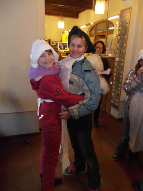Anschließend durften auch wir uns mittelalterlich kleiden. Wir liefen zur Kirche und zu verschiedenen Brunnen der Stadt. Unsere Führerin zeigte uns den Teufelserker und erzählte uns Legenden dazu.