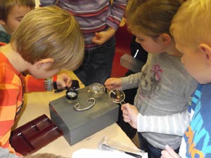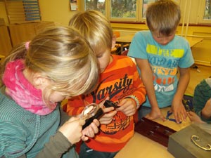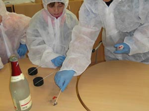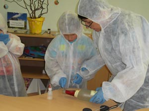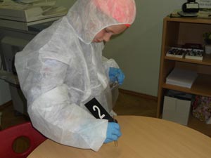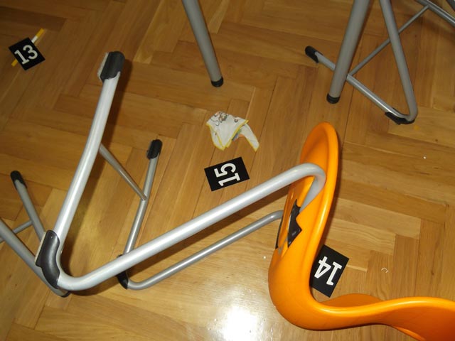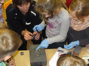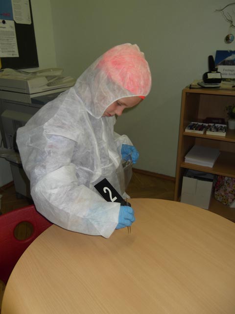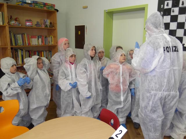 Zuerst wurde natürlich der „Tatort“ abgesperrt. Danach schlüpften alle in blaue Gummihandschuhe und weiße Schutzanzüge. Nach einem erfolglosen Versuch von mir, die Kinder zu identifizieren, betraten wir nun vorsichtig den „Tatort“. Erst mussten alle Beweisgegenstände gefunden und mit einer Ziffer versehen werden. Als nächstes wurden sie mit Pinzette und spitzen Fingern konfisziert. Alle hielten die Luft an und schauten gebannt zu. Nachdem alle Beweismaterialien verpackt waren, war die Arbeit der „Spurensicherung“ beendet.