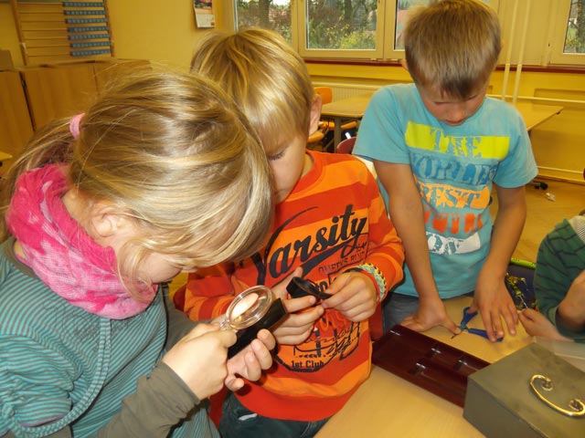 Als die Kinder der zweiten Klasse am 15.10. morgens in die Schule kamen war irgendetwas anders. Nachdem die erste Stunde vergangen war und ich die Pause mit einer gruseligen Vampirgeschichte ausgeschmückt hatte, betraten plötzlich zwei Polizistinnen das Klassenzimmer. Alle schauten gespannt zur Tür. Als Frau Müller erklärt hatte, dass heute kein Unterricht sondern ein Projekt zum Thema „Den Tätern auf der Spur“ stattfinden wird, flüsterten und tuschelten alle begeistert. Nachdem die Kinder in zwei Gruppen aufgeteilt waren, durfte sich die erste schon zum „Tatort“ begeben.