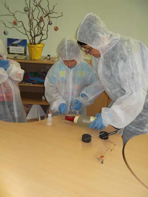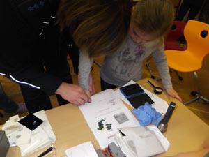 Wir zogen unsere Schutzanzüge aus. Jetzt durften die Kinder einmal selbst „Täter“ spielen. Die Beweise mussten wieder so hingelegt werden, dass auch ihre Mitschüler aus der anderen Gruppe einen „Tatort“ vorfinden, den es zu sichern gibt.