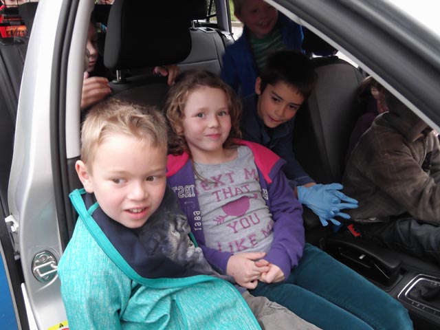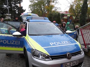 Nachdem die Klasse nun gemeinsam herausgefunden hatte, dass nicht etwa ein Lehrer sondern eine der Polizistinnen der „Täter“ gewesen sein muss, stürmten alle nach draußen. Sie wollten natürlich noch das tolle, neue Polizeiauto sehen! Begeistert drängelten sich alle hinter das Lenkrad.
