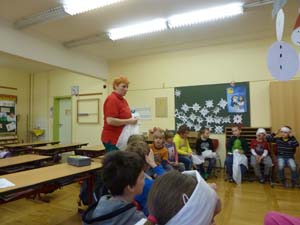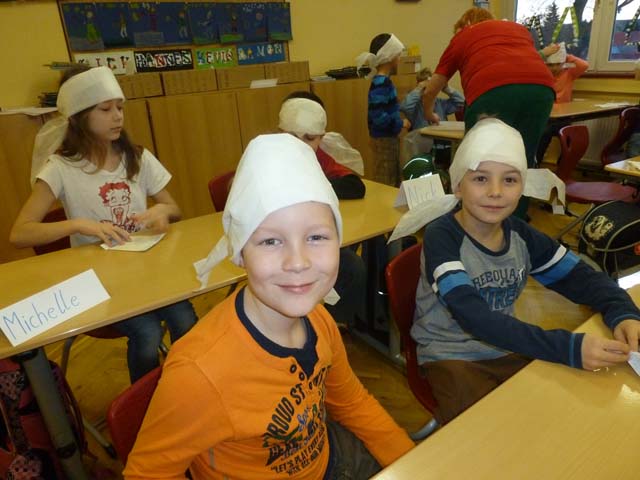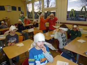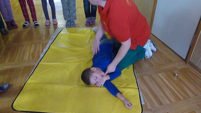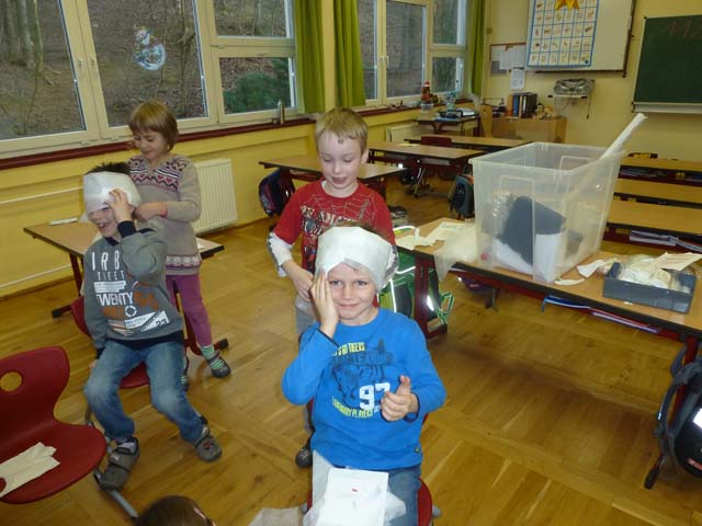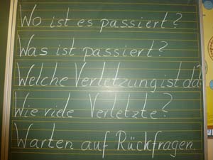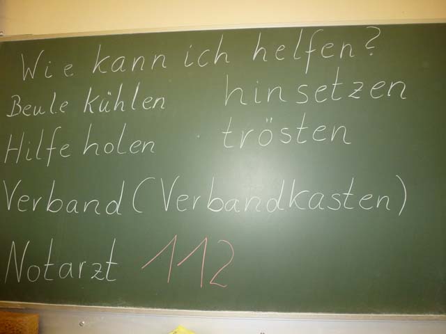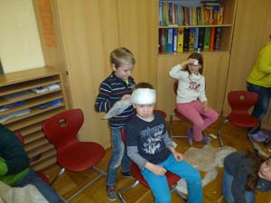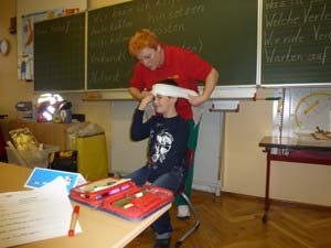 Die Klassen 1 und 2 lernten, wie man sich in Notsituationen verhält. Sie übten, wie man einen Notruf absetzt, was man am Telefon sagen muss und wie man einen Kopfverband richtig anlegt.