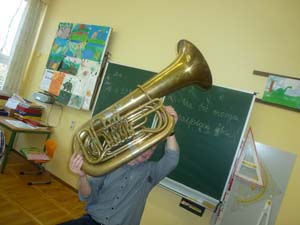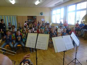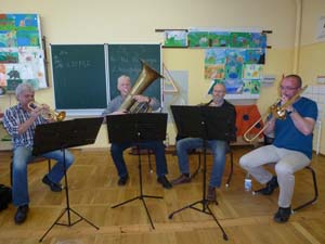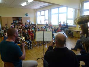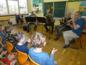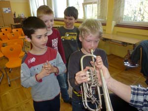 Vier Musikanten eines Orchesters waren bei uns im Klassenzimmer zu Besuch, um uns ihre Blechblasinstrumente vorzustellen. Sie haben uns einige Musikstücke vorgespielt und uns viel über ihre Instrumente erzählt.