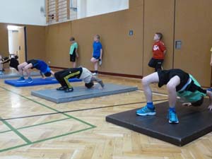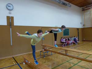 Neu war in diesem Schuljahr, dass alle Übungen in kleinen Gruppen geturnt wurden. Besonderes Augenmerk lag dabei auf Synchronität und Körperspannung.