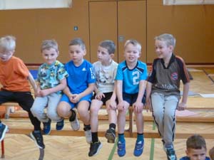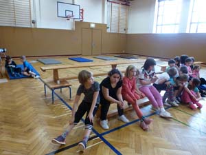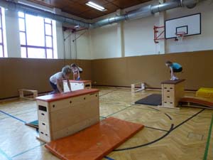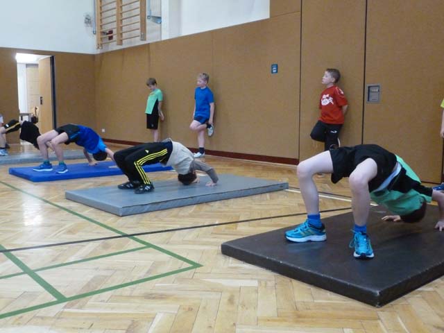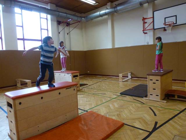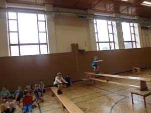 Alle Kinder erarbeiteten sich während des Sportunterrichtes Übungen am Boden, Kasten und an der Bank.