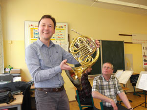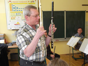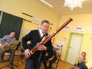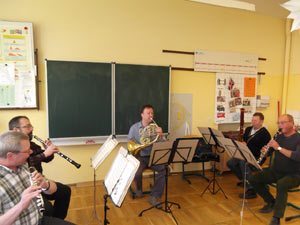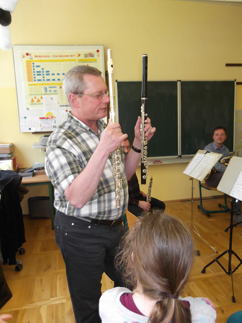 Am Freitag, dem 29. April 2016 besuchten uns fünf Musiker der Elblandphilharmonie mit ihren Holzblasinstrumenten. Diese Instrumentengruppe nennt man ein Bläserquintett. Alle Kinder waren gespannt. Wir erfuhren wie Töne entstehen. Die Männer stellten uns eine Querflöte, eine Oboe, eine Klarinette, ein Fagott und ein Horn vor. Das Horn ist allerdings ein Blechblasinstrument. Die Musiker spielten verschiedene Musikstücke und erklärten uns ihre Instrumente. Sie erzählten uns, wie die Instrumente gebaut werden. Das Holz der Oboe kommt zum Beispiel aus Afrika. Mir hat am besten die Querflöte gefallen.