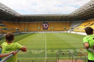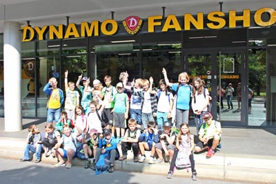 Die Kinder schauten sich an und fragten, ob wir da jetzt wohl hinein gehen. Na klar, das war die erste Überraschung. Wir wurden schon von Lukas, vom Team des Dynamo-Stadions, zu einer Stadionführung erwartet.