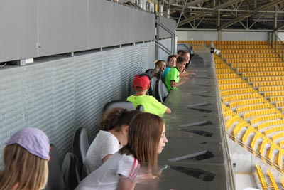 Nun ging es hoch hinaus unter das Dach des Stadions, dort wo die Reporter und Kommentatoren ihrer Arbeit während der Spiele nachgehen. Von da oben konnte man das gesamte Stadion überblicken. Diese Sicht war einfach gigantisch. Die Kinder haben ihre Freude mit Fangesängen zum Ausdruck gebracht.
