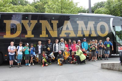 Anschließend konnten wir uns mit einer kleineren oder auch größeren Eisportion erfrischen. Der Ausflug ging nun langsam zu Ende. Wir setzen uns in Richtung Bus wieder in Bewegung. Wir gingen wieder am Großen Garten und am Dynamo-Stadion vorbei. Am Straßenrand stand da plötzlich ein großer Bus mit einer großen Dynamo-Aufschrift. Die Kinder konnten es nicht glauben, es war der Mannschaftsbus von Dynamo Dresden. Alle mussten natürlich gleich Fotos machen.