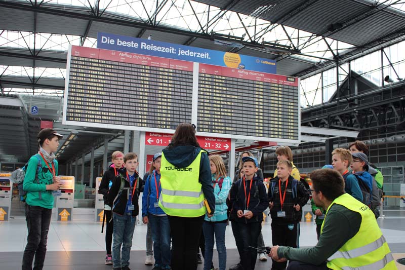 Am 18.05.2018 war es endlich soweit. Mit dem Zug fuhren wir nach Pirna und stiegen dort in die S-Bahn. Direkt am Dresdner Flughafen stiegen wir aus. Dort wurden wir von zwei Mitarbeitern erwartet. An der Flugtafel bekamen wir die verschiedenen Abkürzungen der Flugzeuge erklärt. Dann ging es weiter zum Check-in-Schalter. Dort erfuhren wir, was alles nicht in den Koffer gehört, wie schwer der Koffer sein darf und was die Angaben auf dem Kofferetikett bedeuten. Dann liefen wir weiter und staunten, wie viele Leute in Uniform uns begegneten. Da waren nicht nur Flughafenmitarbeiter und Servicepersonal, sondern auch viele Polizisten und sogar ein Pilot.