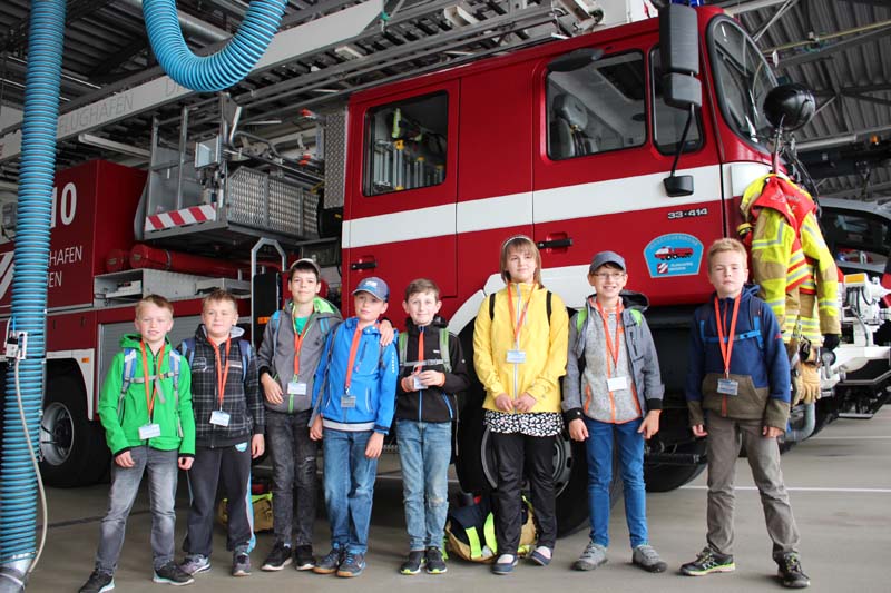 Drei „Panther“ waren dabei. Wir durften jede Menge Fragen stellen. Plötzlich ertönte ein Signal über den Lautsprecher der Feuerwache. Wir dachten sofort an einen Einsatz. Doch dann kam die Durchsage: „Das Mittagessen ist fertig!“ Das fanden wir natürlich lustig...