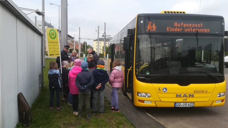 Dort erwartete uns bereits ein DVB - Linienbus. An Bord waren schon zwei DVB- Mitarbeiter und natürlich die Polizei. Beim Einsteigen durften die Kinder ihre speziell für diesen Tag ausgegebenen Kinderfahrscheine entwerten.